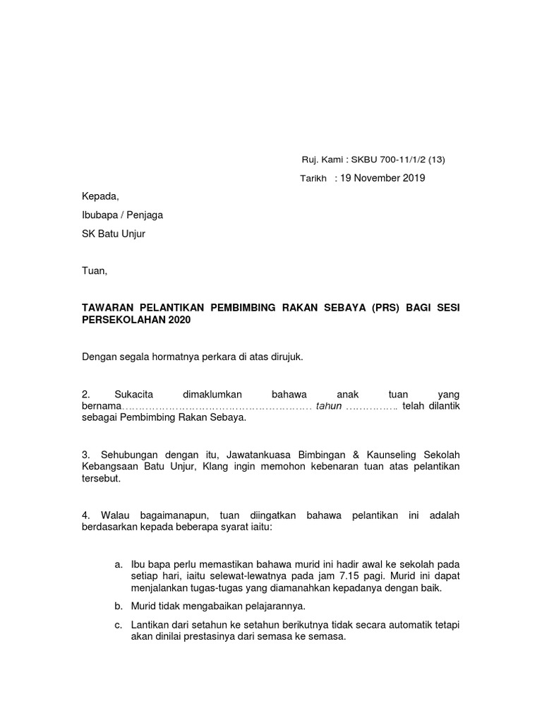 Surat Lantikan Pembimbing Rakan Sebaya Sekolah Rendah