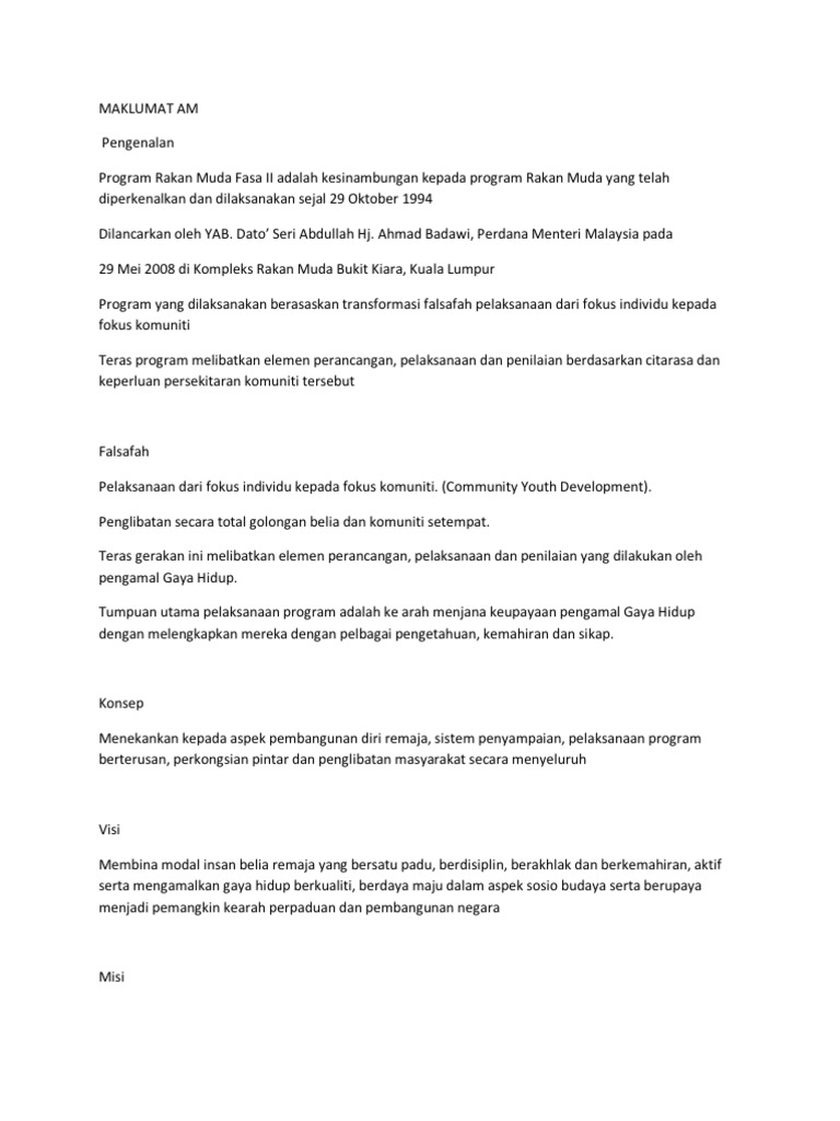 Objektif Membangunkan watak dan imej diri remaja dengan penerapan nilai-nilai positif berdisiplin hormat-menghormati. Dilancarkan pada 29 Oktober 1994 oleh YAB. Nice to meet u all in this blog.
