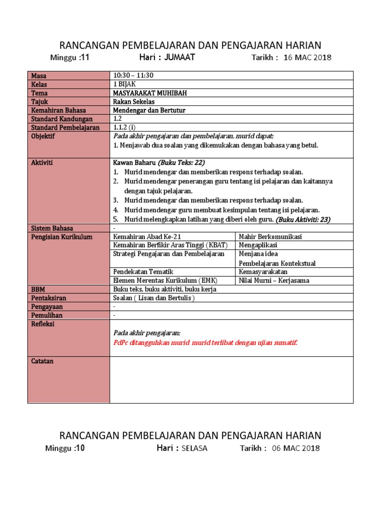 Unit 4 Rakan Sekelas Doc Rancangan Pengajaran Harian Bahasa Melayu Tahun 1 Tarikh Masa Kelas Tema Tajuk Kemahiran Bahasa Standard Kandungan Standard Course Hero