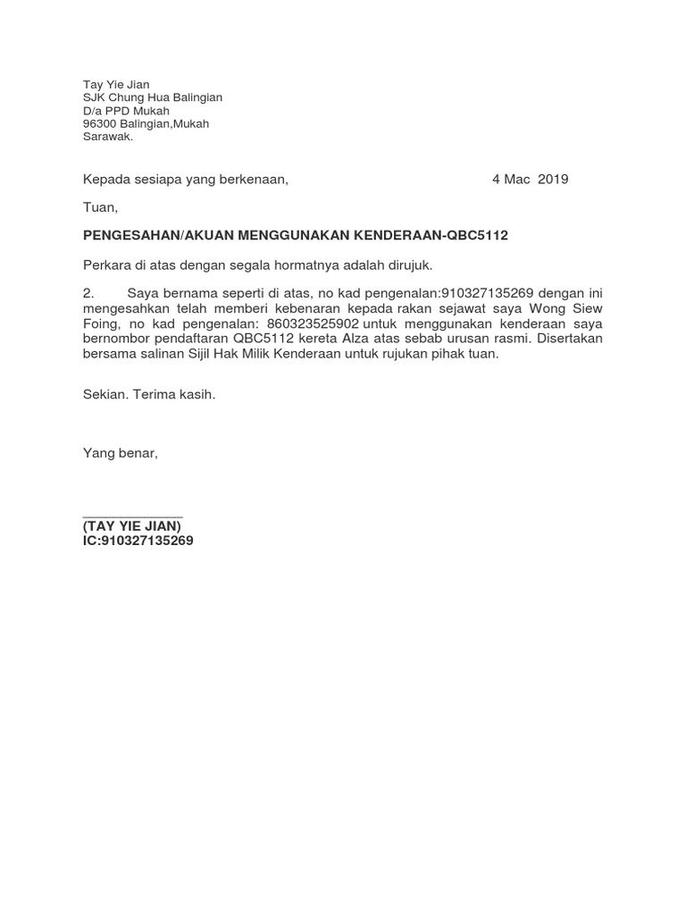 Hanya dua 2 orang termasuk pemandu dibenarkan menaiki sebuah kenderaan persendirian dalam. Contoh Surat Kebenaran Penggunaan Kenderaan. Contoh Surat Kebenaran Rakan Kongsi Membuat Pinjaman have a graphic associated with the otherContoh Surat Kebenaran Rakan Kongsi Membuat Pinjaman In addition it will include a picture of a kind that might be seen in the gallery of Contoh Surat Kebenaran Rakan Kongsi Membuat Pinjaman.